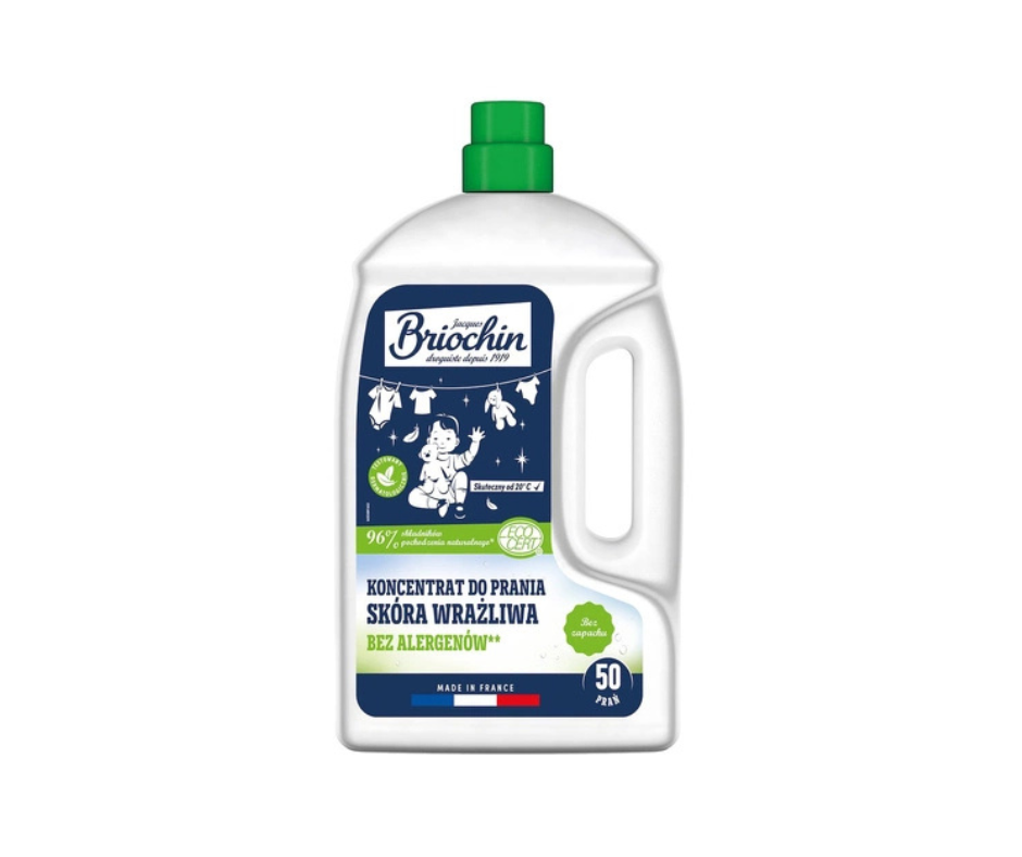 Koncentrat do prania Briochin, stworzony z myślą o skórze wrażliwej, to idealne rozwiązanie do prania ubranek niemowlęcych oraz odzieży dziecięcej, a także odzieży osób z alergiami lub nadwrażliwą skórą. Formuła produktu nie zawiera sztucznych dodatków: barwników, optycznych wybielaczy, alergenów co czyni go bezpiecznym do stosowania w każdym domu, w którym komfort skóry jest priorytetem. Koncentrat wystarcza na 50 prań.