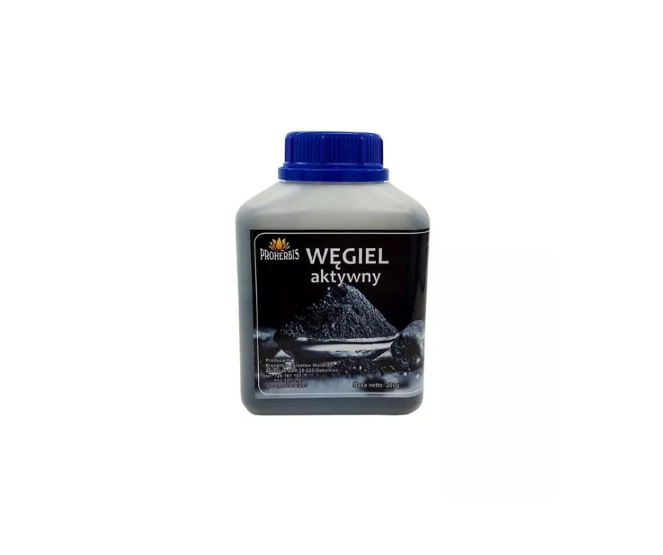 PROHERBIS – węgiel aktywny zawiera sproszkowaną skorupę orzecha kokosowego i stanowi barwiący dodatek do lodów, słodyczy i kremów.